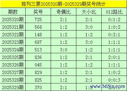 开奖总结:罗列三第2025329期奖号为:370,其奇偶比为2:1,大小比为1:2,奖号012路比为2:1:0。